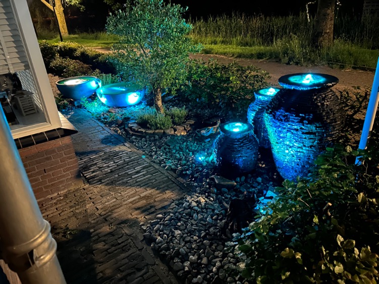Doordat veel mensen overdag aan het werk zijn en pas in de avond kunnen genieten van hun tuin is verlichting dus een absolute must. Hierdoor kun je tot in de late uren genieten van een prachtig schouwspel van bewegend water en verschillende kleuren licht in jouw tuin.